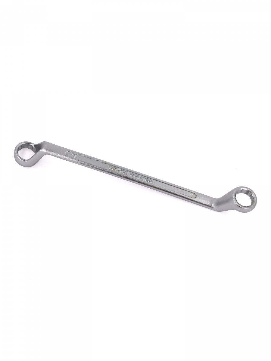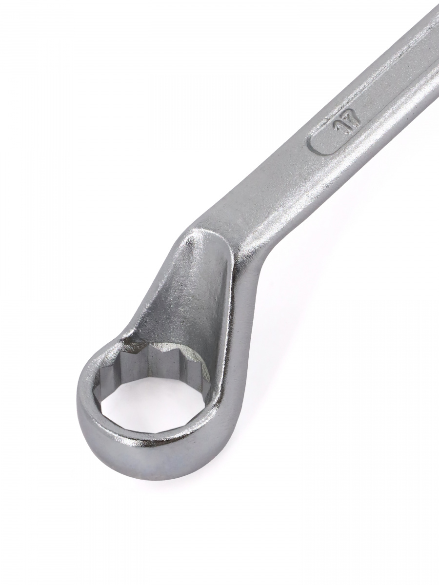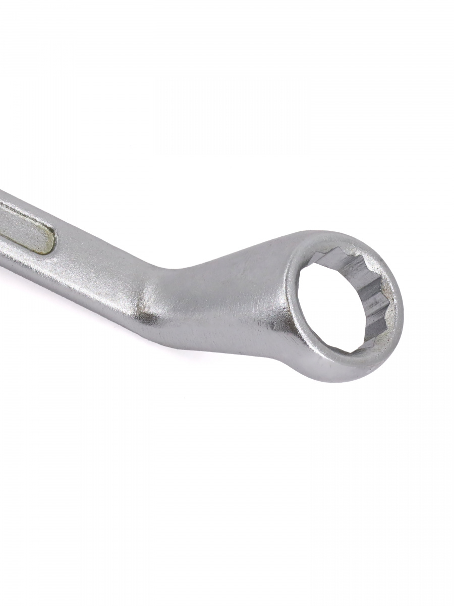 Накидные рабочие части ключа смещены относительно его рукоятки, что позволяет работать в труднодоступных местах.
