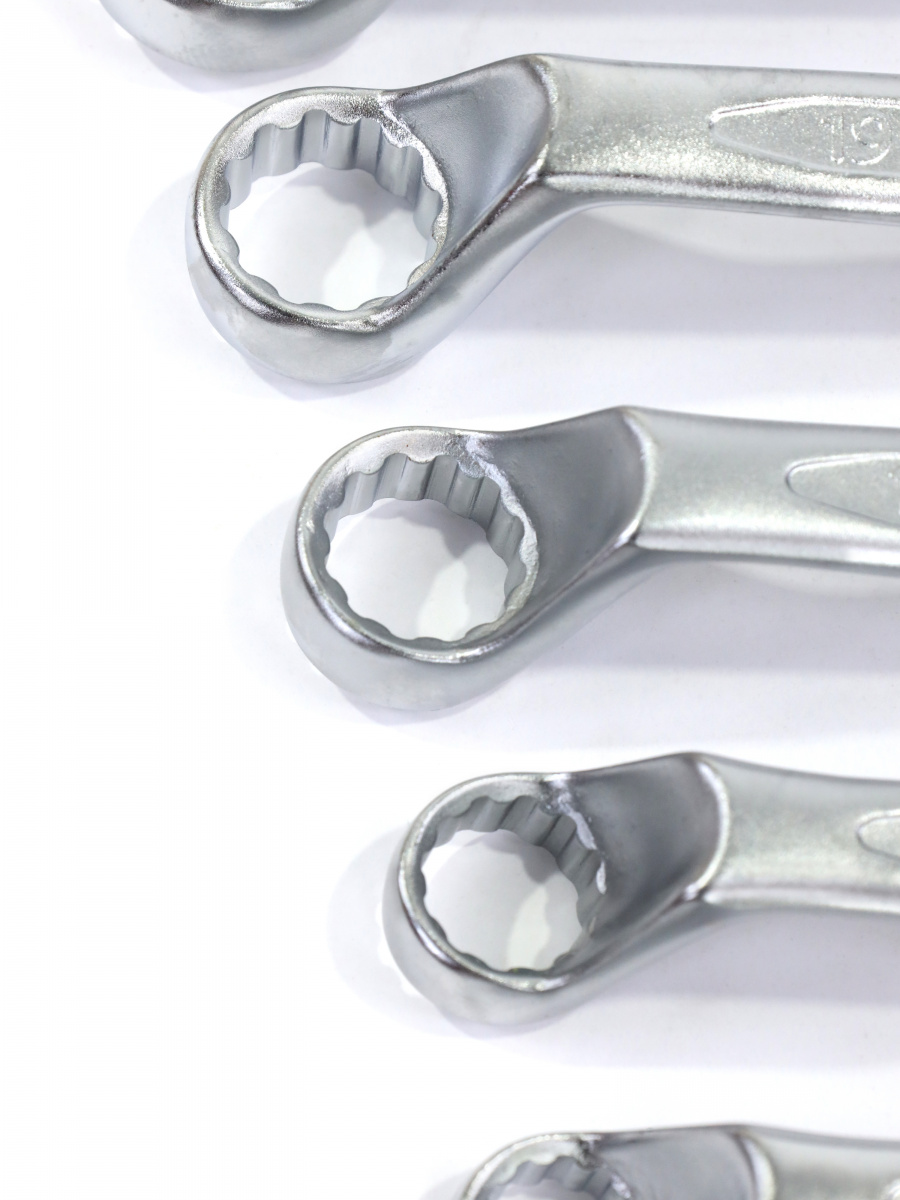 Ключ коленчатый (накидной) - это инструмент для работы с резьбовыми соединениями, имеющий форму колена и накидную гайку на одном конце и гайку на другом конце. Коленчатый ключ используется для работы с трубами, гайками и болтами, которые находятся в труднодоступных местах.Ключ изготовлен из хромованадиевой стали CR-V , которая обладает высокой прочностью и износостойкостью. Он предназначен для работы в условиях высоких нагрузок и экстремальных температур, что делает его идеальным инструментом для использования в автосервисе, строительстве и других отраслях.
