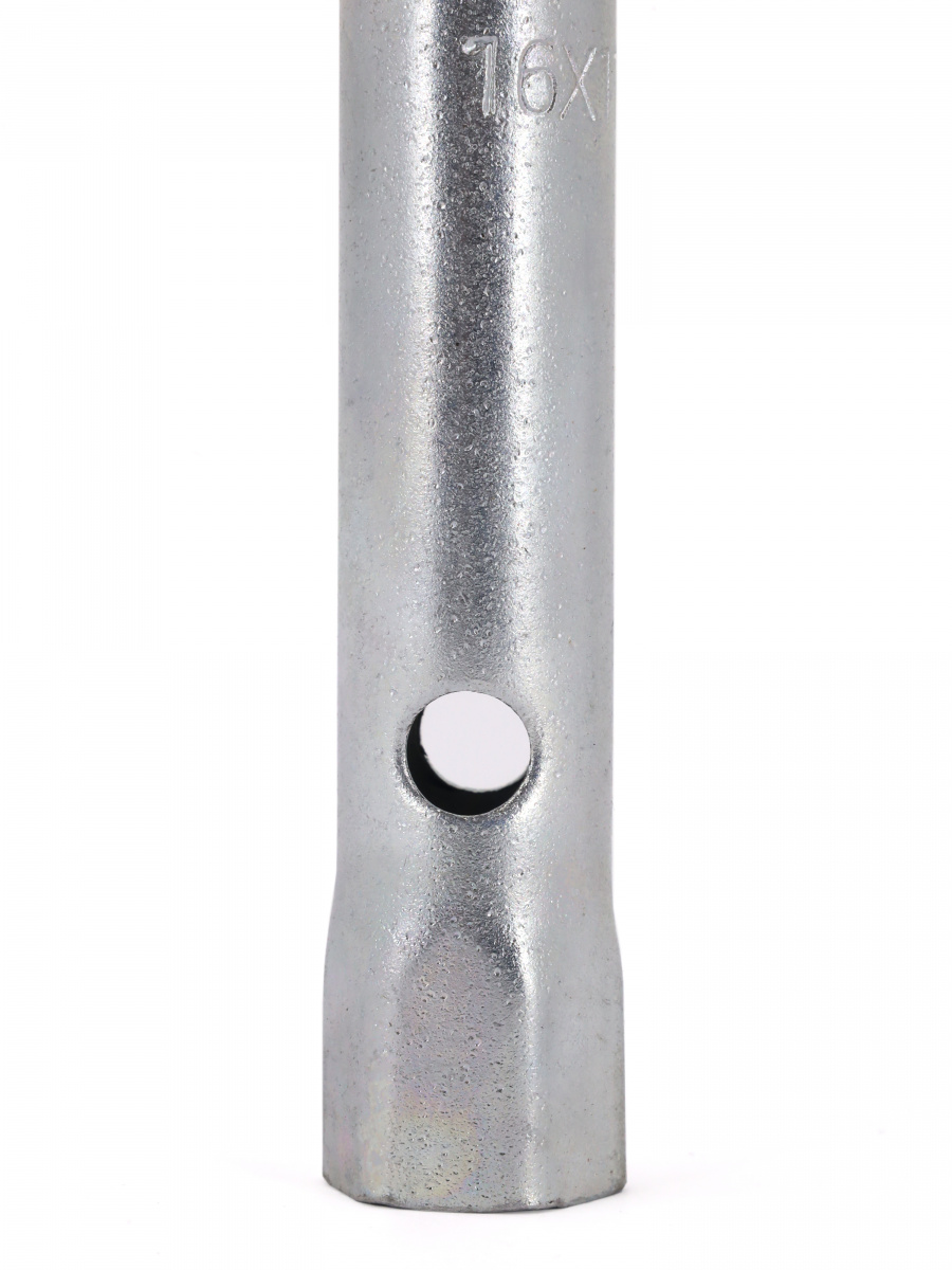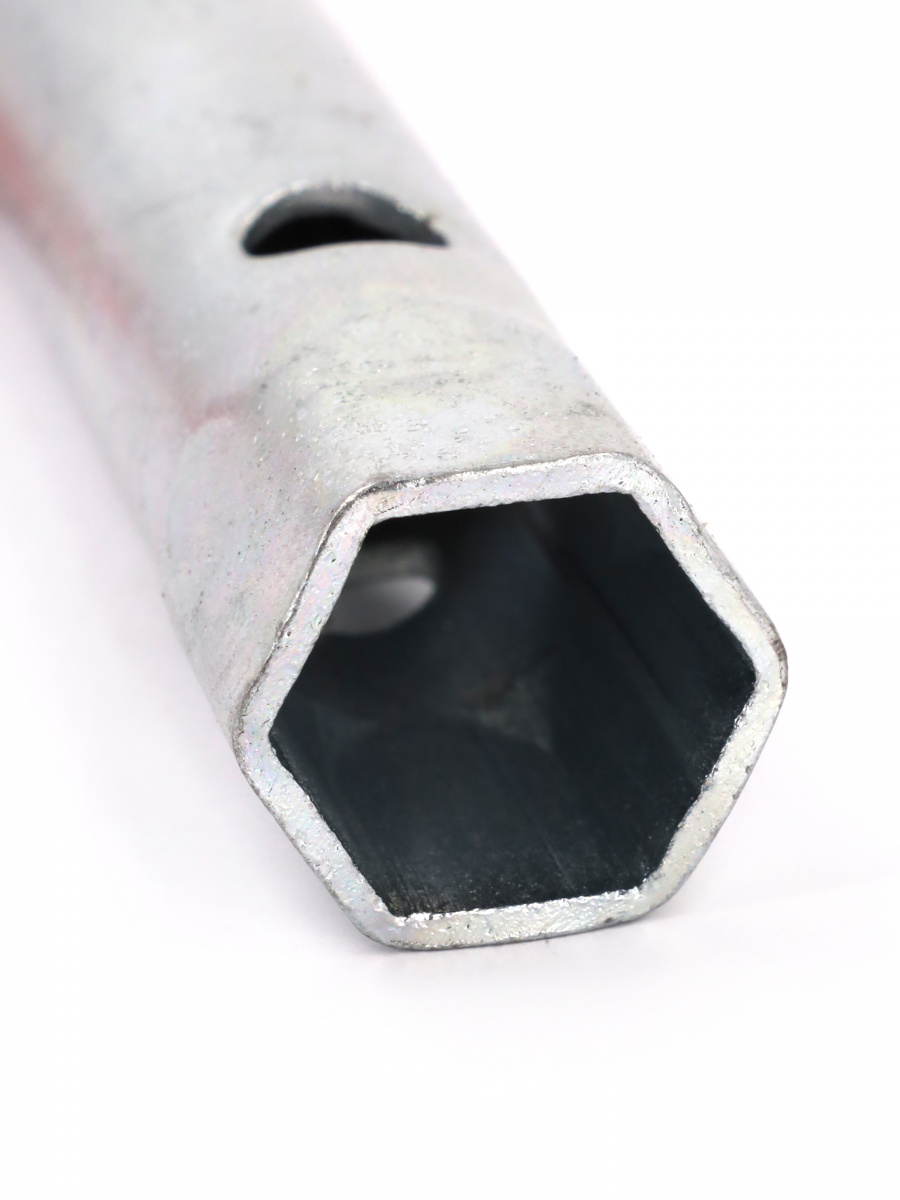 Ключ трубчатый штампованный - это ключ, который используется для затягивания и ослабления резьбовых соединений на трубах. Он имеет форму трубки с двумя головками на концах, которые позволяют захватывать трубу и затягивать или ослаблять соединение. Применяется для работы со шпильками, датчиками, свечами зажигания. В качестве привода применяется вороток
